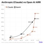 The line graph compares the annual recurring revenue (ARR) growth of Claude (Anthropic) and OpenAI between mid-2023 and mid-2026. Overall, both companies show significant upward trends, but OpenAI maintains a…